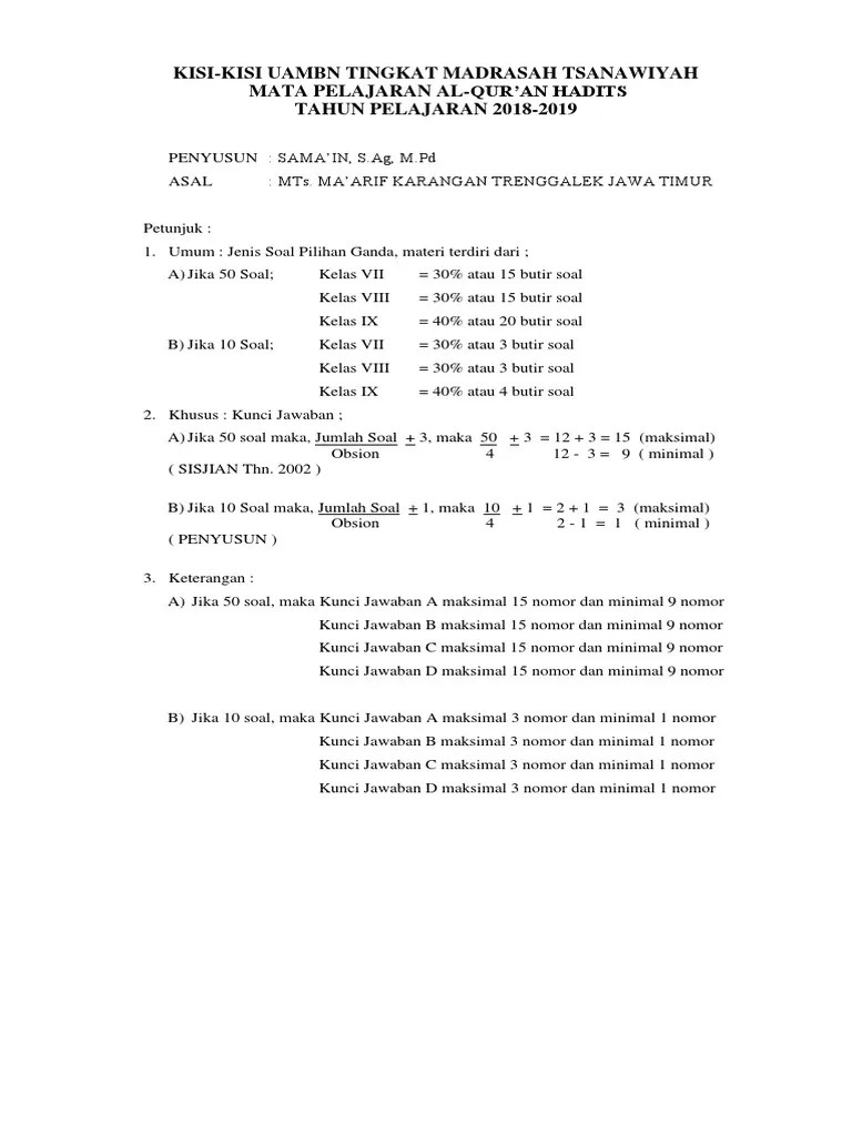 Contoh Soal Uambn Mts - Soal Persiapan Uambn Ski Untuk Mts Pdf - Uambn adalah ujian akhir madrasah berstandar nasional yang dilaksanakan pada .. Contoh soal matematika ujian madrasah (um) mts sudah dilengkapi oleh. Kumpulan ujian akhir madrasah berstandar nasional uambn mts ini sebagian telah dilengkapi dengan kunci jawaban. Latihan soal dan kunci jawaban uambn al quran hadist mts tahun 20192020 yang bersumber dari naskah asli soal . Contoh soal try out uambn mts. Dan ujian akhir madrasah berstandar nasional (uambn) tahun 2021 .